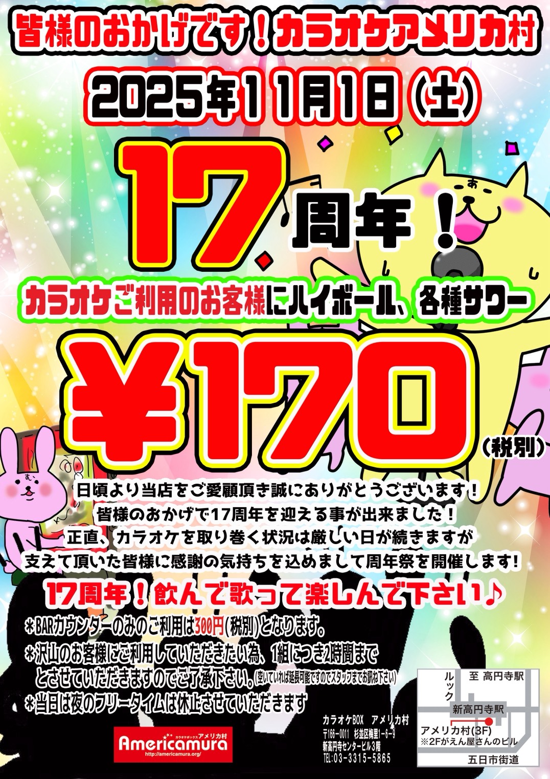皆様のおかげです!カラオケ アメリカ村17周年!2025年11月01日(土)